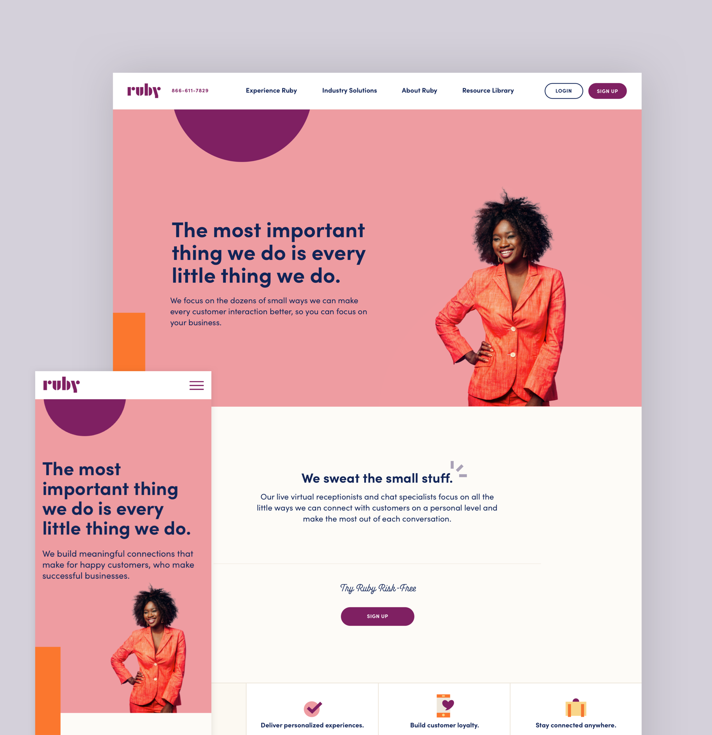 Ruby is a Portland-based technology company and leader in live virtual receptionist services. Known for their joyful, human approach to customer service, Ruby needed a website that clearly communicated their offerings while letting their playful personality shine through. I partnered with Studio DAD, Ruby’s brand design team, in-house developers, and the Ruby team to bring their new website to life.