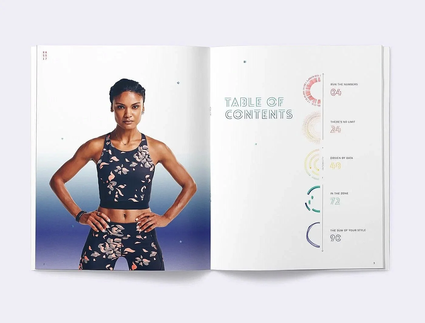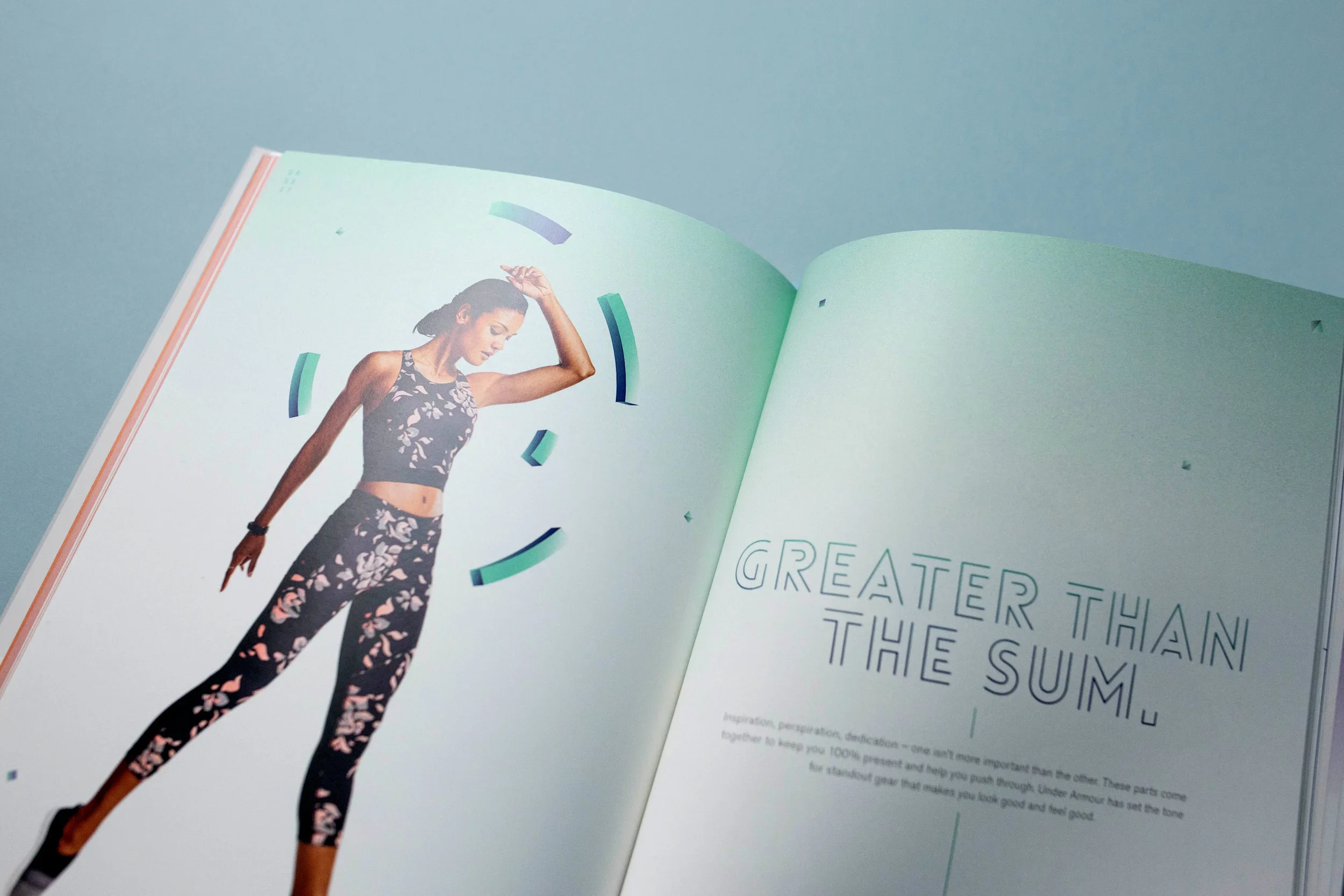 Vellum paper was introduced throughout the book to physically express layers of data and information. Overlapping content, graphics, and imagery mirrored the way performance metrics stack and evolve during activity. A custom display type was selected to feel both sporty and illustrative, reinforcing the graphic system while pushing beyond Under Armour’s typical visual language.